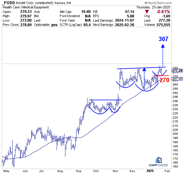Of the trade ideas we’ve suggested in recent weeks, the best ones have been ISRG and BSX, both of which are medical equipment stocks – like PODD. A breakout through the 280 zone would target 307.