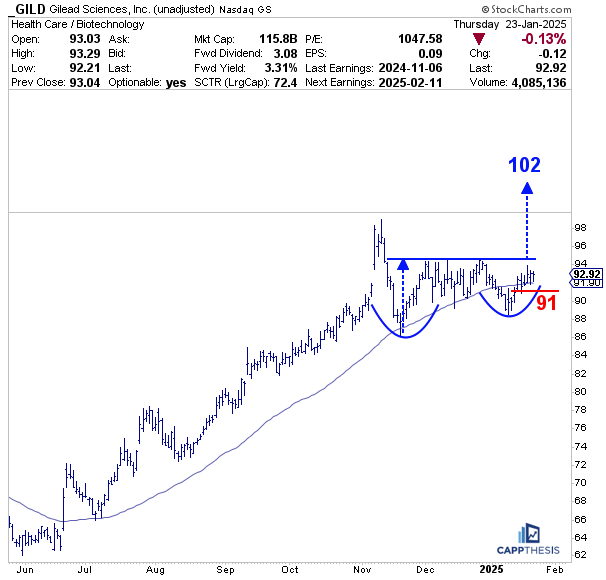 Biotech stocks have had a wild ride over the last few months, too. GILD has been one of the best within the group since November, managing to hold near its 50-day moving average after the post-election dip. And because it did, the stock now has formed a potential cup and handle formation. A breakout above the resistance line (just below 95) would target the 102-zone.
