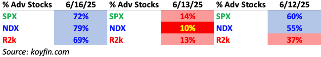 Market internals were solidly positive across the board yesterday. The NDX did the best, as nearly 80% of its holdings logged gains.