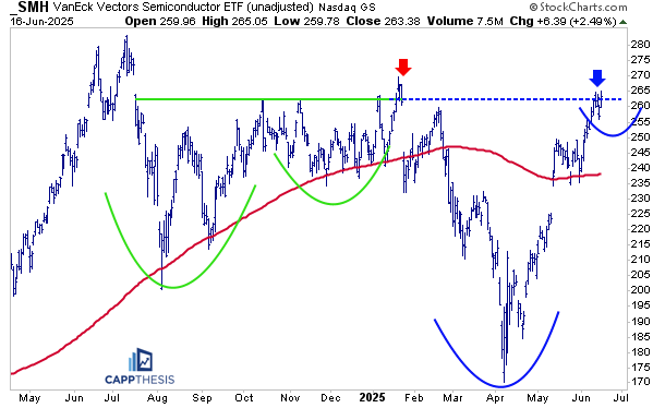 SMH is now trading above its February 2025 highs, though it remains below the January peak—and still well off its July 2024 all-time high. As we’ll recall, SMH wasted a nearly textbook bullish cup-and-handle pattern with that January head-fake (see red arrow).