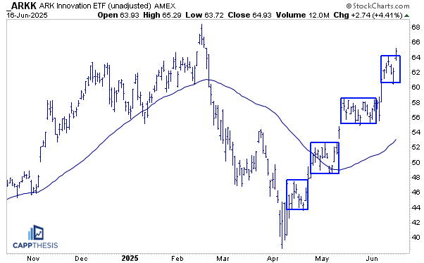 ARKK is one step ahead of the SPX when it comes to trading box breakouts. Yesterday’s 4% surge marked the fourth consecutive breakout from a consolidation range.