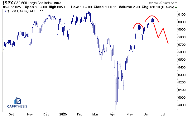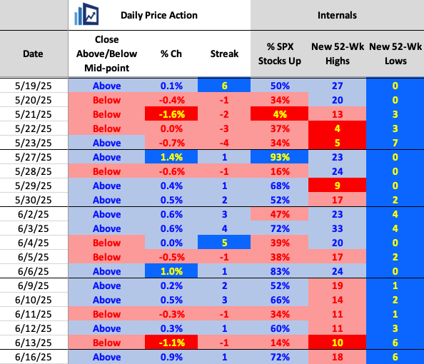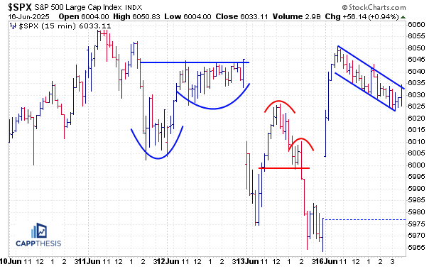 If nothing else, this shows us that there’s been lack of follow through on both sides the last week and change. Again, with the SPX up 25% from the lows, battling the psychologically significant 6,000 zone in front of tomorrow’s FOMC meeting, amongst the backdrop of the mid-east conflict, the recent pause has been the best-case scenario.