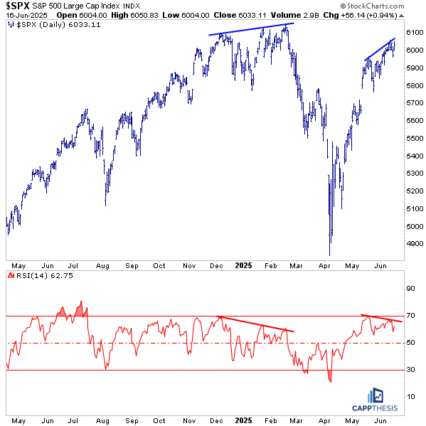 This type of divergence is common during digestion phases, which the market appears to be in now. But we’ve seen this before: a similar RSI divergence from December through mid-February correctly flagged internal weakness before the market rolled over. We now know why that selloff happened—but as long as this condition persists, it’s worth watching closely.