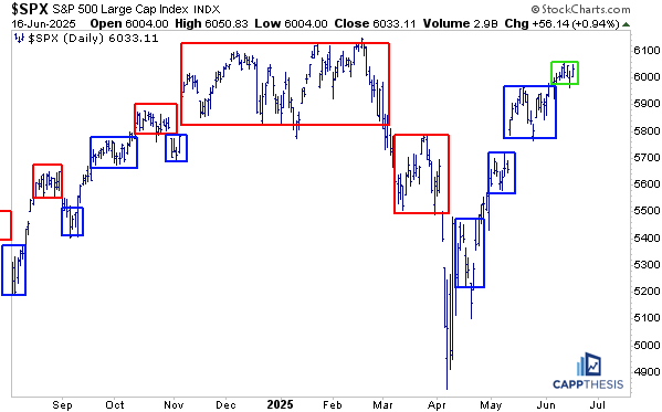 Trading boxes are patterns too—just not in the classical sense. They’re useful because they define the upper and lower boundaries of a trading range, which tends to appear when the market is in digestion mode. And while it might not feel like it, the market has experienced several such phases since the lows. Drawing boxes around price action is a simple and effective way to highlight that.