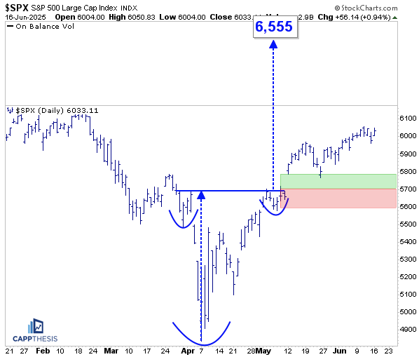 Now, SMH has returned to that same level, and a new potential bullish structure is forming—this time built from a series of smaller bullish patterns off the April lows. While the move feels extended, it’s worth noting that SMH is essentially flat over the past 12 months. From that standpoint, it was far more stretched last June than it is today.