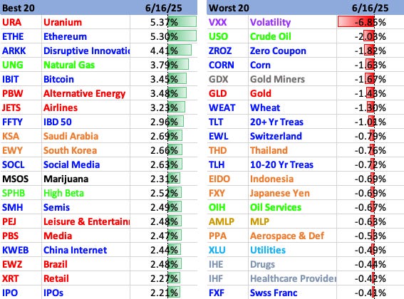 Uranium continued its recent spike on Monday, with Ethereum, ARKK and Bitcoin ETFs right behind it. Bonds, foreign ETFs and healthcare lagged.