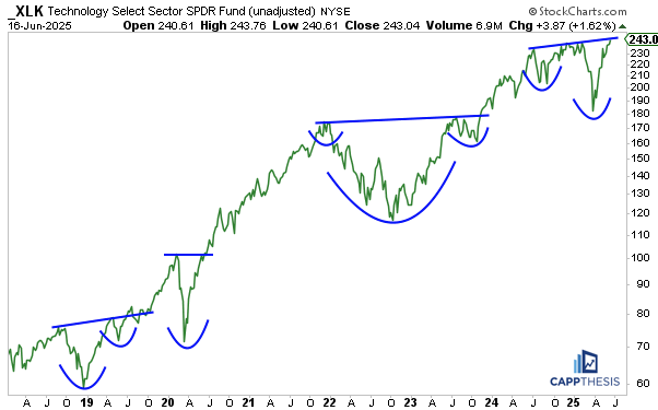 If XLK “simply” follows the path from the last three breakouts to new highs, then, yes, we could see even more upside. Having another pause before that happens could help the foundation build a bit more.