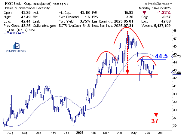 Lastly, while there aren’t many bearish patterns out there, EXC has been tracing out a large topping pattern the last few months. We trust all potential breakouts and breakdowns. Thus, if EXC falls much further, it would trigger this head & shoulders pattern. With very light support under current levels, the downside target would be near 37.