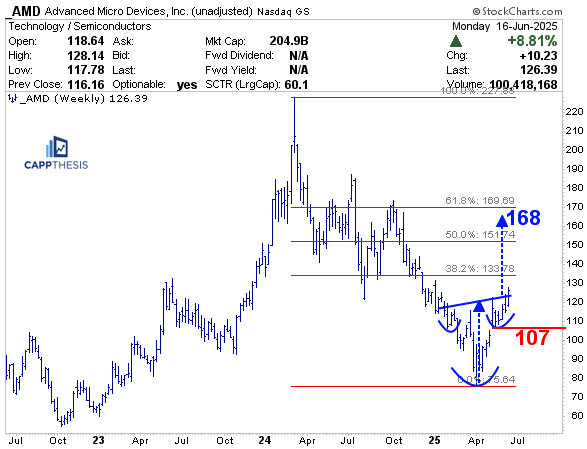 AMD was the best performing S&P 500 stock yesterday, up nearly 9%. And while chasing any stock up that much isn’t recommended in the short-term, that move prompted a long-term breakout on its weekly chart. Should that breakout see some follow through, the upside objective would be up at 168. That’s very close to the 61.8% retracement of the entire 2024-25 decline (170).
