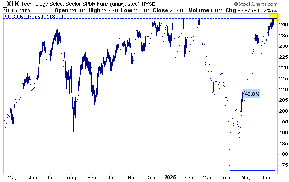 The XLK ETF was up another 1.6% on Monday, which puts the move from the low at +41% in about nine weeks. Incredible. The ETF also made a new ALL-TIME HIGH yesterday, completing the massive 180-degree turn. So, what are the odds that we’ll now see even more upside? Scroll down.