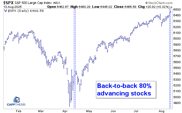 āBack-to-back 80% breadth days (ā„80% advancing SPX stocks) are rare bullish signals, often after weakness. After April 11-14, 2025, SPX rose ~20% in 4 months post-crash recovery. In Nov 2024, it preceded short-term gains but later volatility. In Sep 2023, a dip followed, then +7% by year-end and more. Overall, they tend to herald strength, though not without risks.ā
