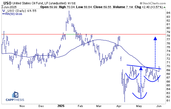 USO was up 3.6% yesterday with Crude Oil rallying. It’s getting closer to breaking out of the potential inverse head & shoulders pattern we profiled last week.
