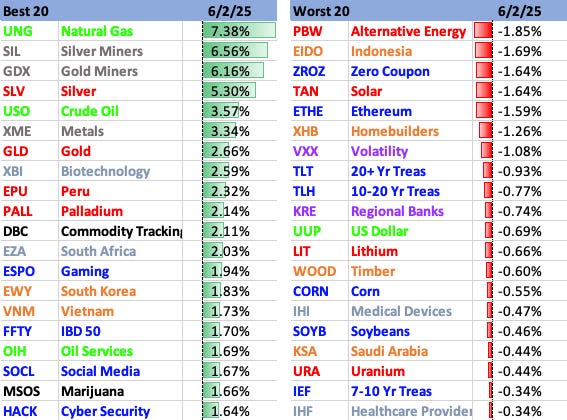 Commodities were the clear leaders on Monday, especially metals. Growth ETFs also were among the leaders, but not from mega-cap. HACK hit a new all-time high.