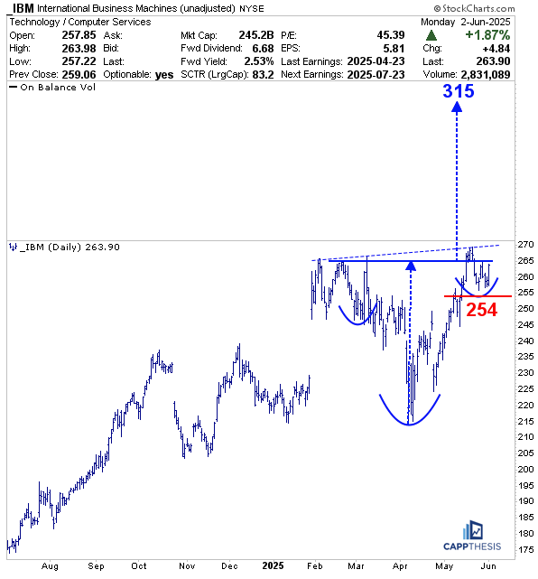 We’re using the former high points from February and March to draw the neckline from, and a measured move would result in a lofty target near 325. Indeed, IBM would need to overtake the May high (269) first, but the pattern is clear and another leg higher could entice momentum chasers.