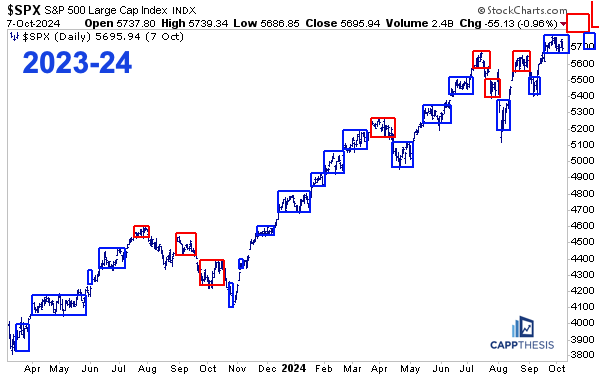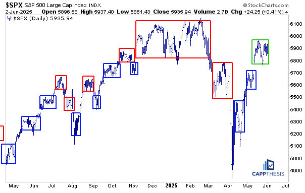 We haven’t discussed trading boxes lately, but we’ve been keeping track of them since the pivot low. And now, after seeing SPX break BELOW three of the last four trading boxes (red), the index will be trying to break out from its third straight box.