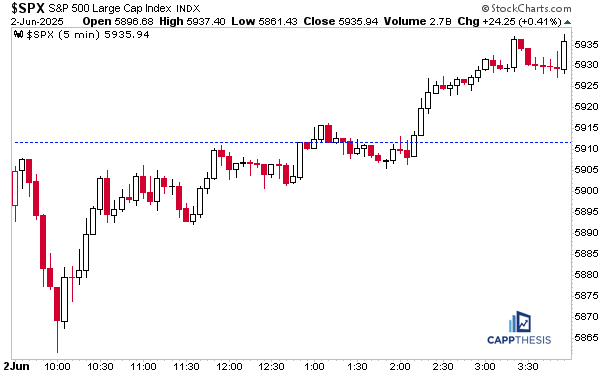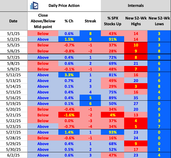 The SPX now is up four of five trading days, which has been a solid response to the four-day losing streak from 5/20 – 5/23. The index now has closed above its intra-day midpoint in 11/15 trading days. That’s 73% of the time, which is high and obviously bullish.