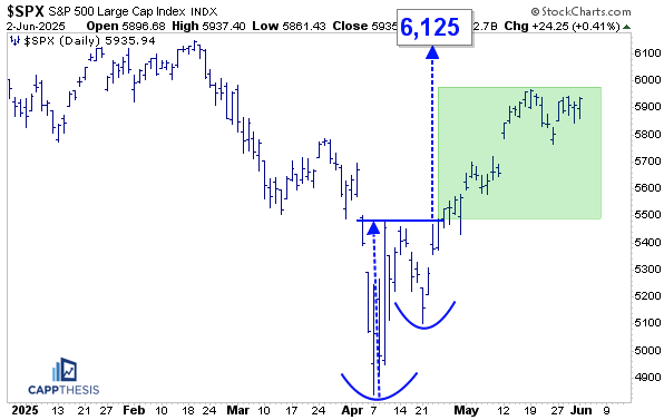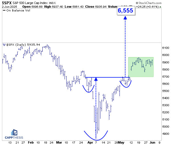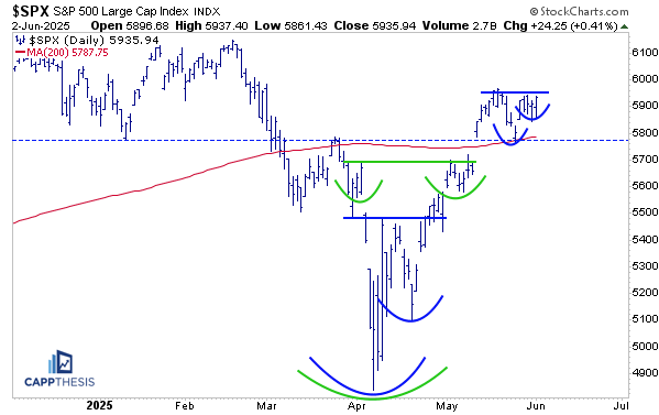 With yesterday’s comeback, the potential short-term bullish pattern still is a possibility, as well. A breakout above 5,950 would trigger it.