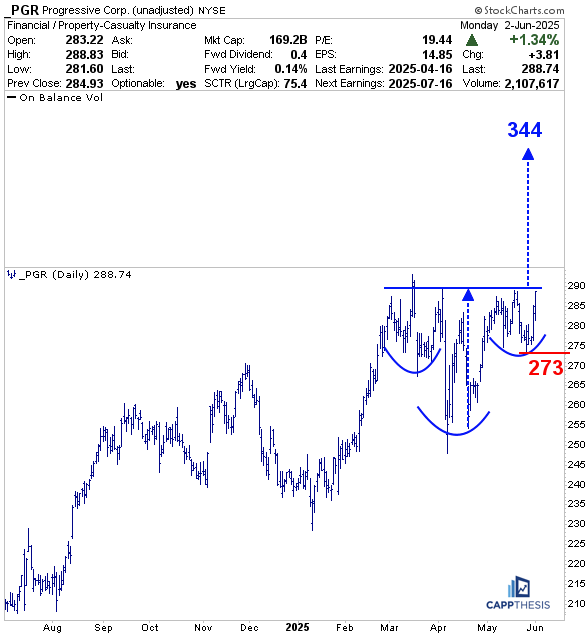PGR has done a good job over the last five weeks digesting its sharp bounce from the April lows, although the price action has been volatile since then. All of that has created this potential inverse H&S pattern. An eventual breakout through the 290-zone would target the 344-area, which would be way above its former March highs.