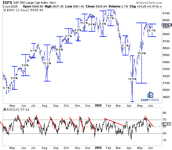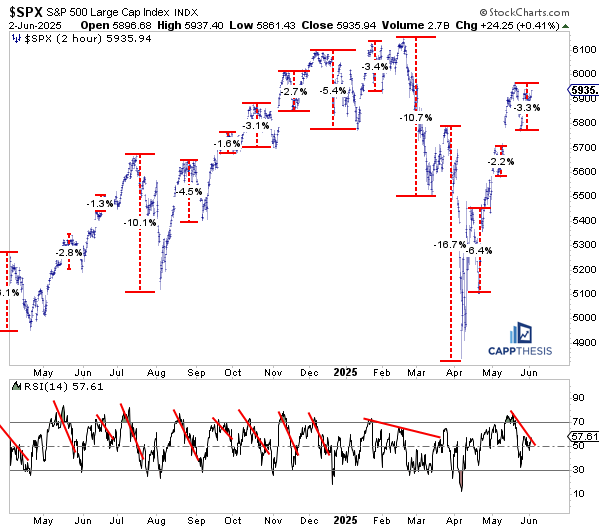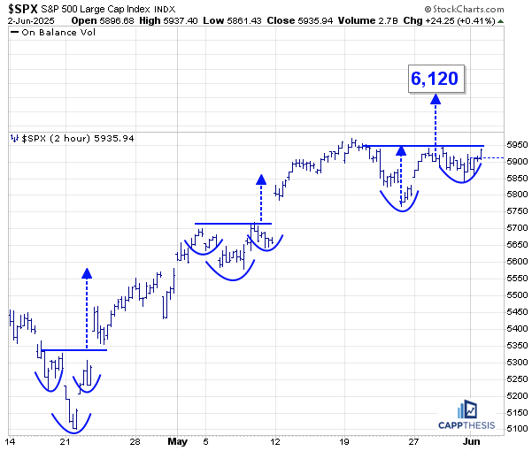 As stated many times, if the SPX is going to continue advancing and ultimately surpass its February and all-time highs, it’s more likely to do so in a steadier, more orderly fashion than what we saw from the April lows through early May. That means the short-term rallies (best viewed on this two-hour chart) will be smaller…