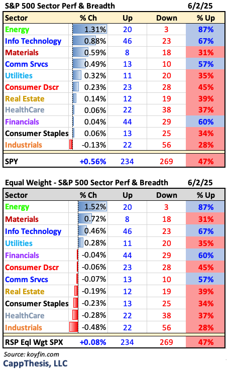 Only four sectors had positive internals yesterday, but he negative ratios weren’t terrible for the lagging sectors. Only Industrials had fewer than 30% advancing stocks. Energy led the sectors for the day for the first time since 5/9/25. More on Energy below in the Key Charts section.
