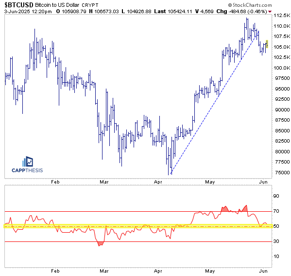 The recent pullback forced BTC below the steep and steady uptrend line that had confined the price action from the April lows through late May.