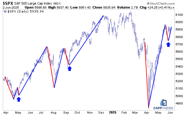 Speaking of higher lows, here’s an updated chart comparing the recent pullback and bounce to two prior very important periods. The first pullbacks in late April’24 and September’24 were bought. That’s obvious, but the traders who bought that dip continued to buy breakouts and dips in the ensuing weeks and months both times. That made the second legs of those respective upswings noticeably longer than the initial impulsive bounce.
