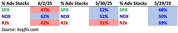 The NDX did the best from an index breadth perspective yesterday, as Small Caps lagged.