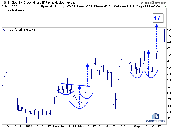 SIL’s huge day on Monday put it very close to the first of our multiple bullish targets (47).