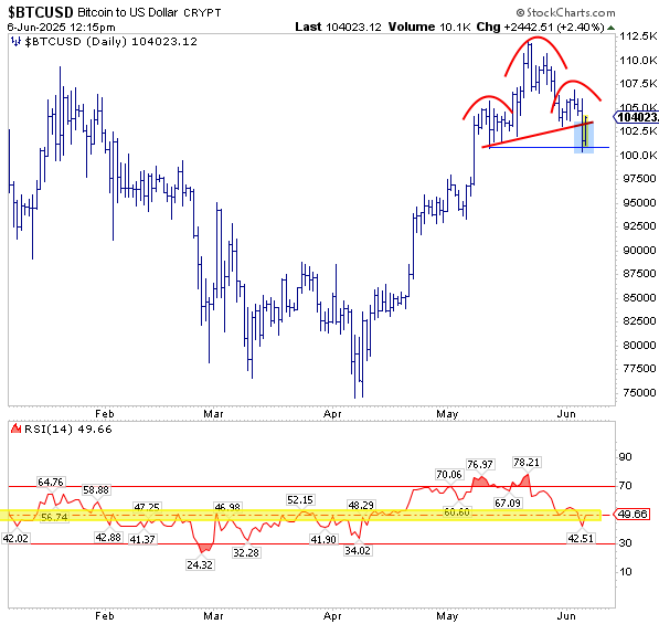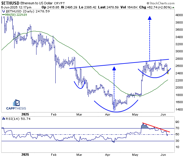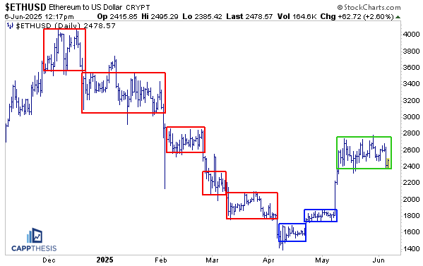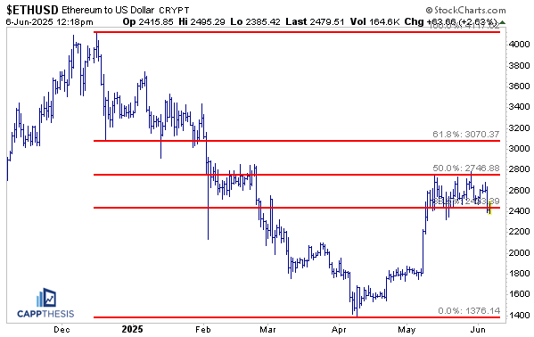 Lastly, in the third chart, Ethereum continues to struggle near the 50% retracement level of the decline from its December 2024 peak to the April 2025 low. That will need to change for a potential breakout finally to occur.