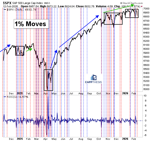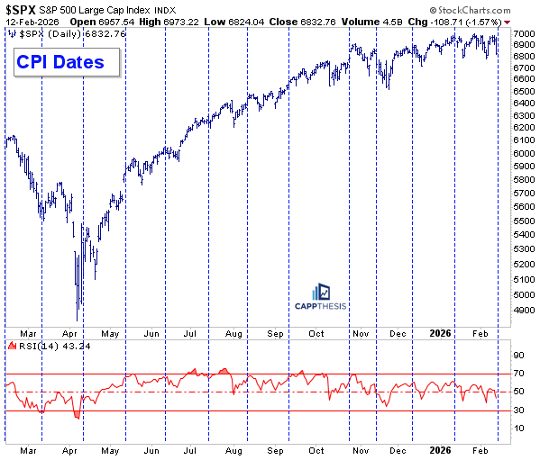 As we know, the S&P 500 has followed the last two CPI releases with immediate gains of at least 1%. That was especially emphatic last Friday, when the index rallied 2% after a prior 1.2% decline. Going back to January 20–21, we’ve now seen five 1% moves in roughly three weeks.