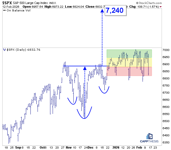 It’s also important to keep the S&P 500’s position in mind. While the index may feel extended and hovering in the danger zone just described, from a pure price-level perspective, it’s essentially in the same spot since the October release – trading roughly between the 6800–7000 range on the day of each of the prior four reports.