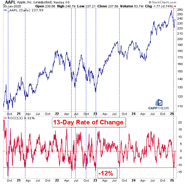 We profiled AAPL two Fridays ago on 1/17 with this chart that showed how the stock had dropped 12% in 13 trading days. Prior 13-day, 12% declines led to bounces each time since late 2020 -some better than others. It bottomed again a few days later.