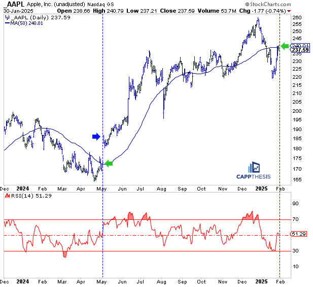 AAPL was reeling for a longer amount of time back then, but it had just rallied 7% off its low, which brought the RSI back to the mid-point right before it reported earnings. The extremely strong reaction then shot the stock above its 50-DMA the following morning – like now. From the open price that day to its trading peak in July, AAPL gained 27%.
