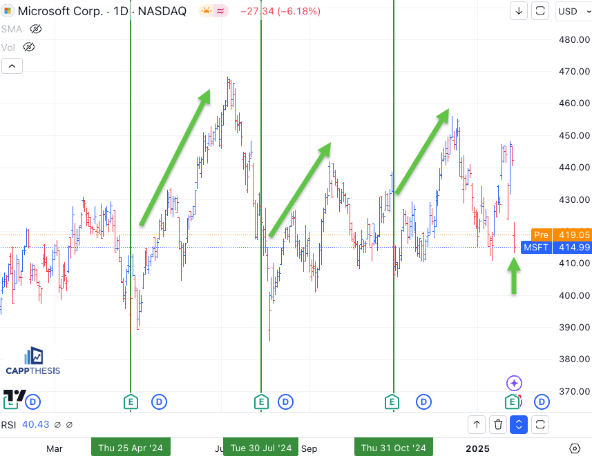 MSFT bottomed soon after reporting earnings the last three times going back to April’24. While those rallies didn’t help the stock break through its now, year-long trading range, those were the times to take advantage of short-term weakness.