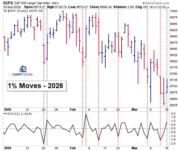 Here’s a chart of all of the 1% moves so far in 2026. After yesterday, there are now three 1% gains versus six 1% declines. That’s not a lot over roughly 10 weeks, but three have occurred within the last seven trading sessions. If that pace were to continue, it could become troublesome.
