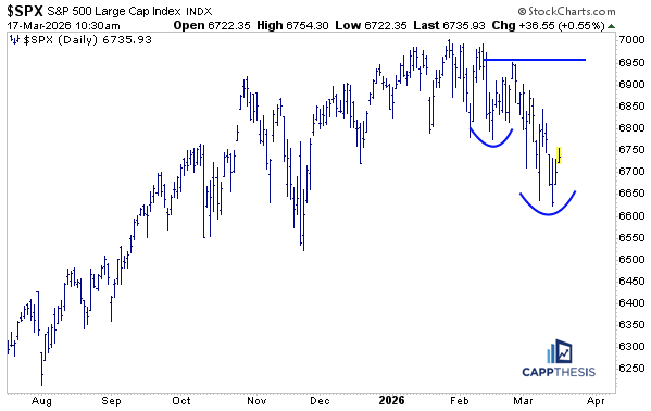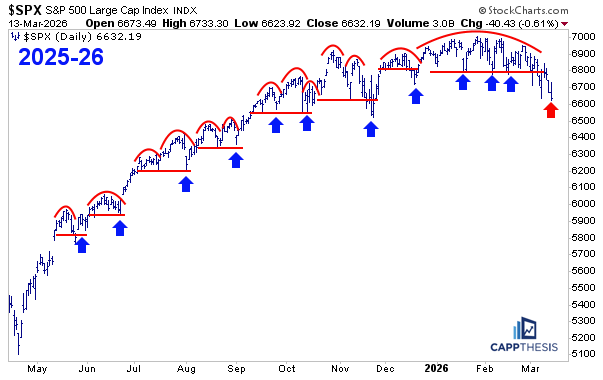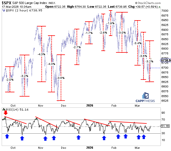 The index’s most recent pullback got to about 3.2% from this past Monday’s intraday high to Friday’s low. As is clear, it’s pretty much in line with the intraday drawdowns we’ve seen going back to last October. Whether the market was moving higher overall or not, the pullbacks after a bounce have generally been around the same size and duration.