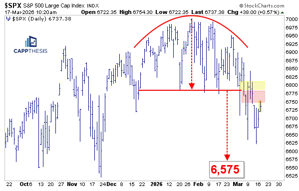 Despite yesterday’s strong rally, the SPX again finished below its recent bearish breakdown zone. The downside target remains near 6,575. This isn’t too far away but simply hitting a bearish pattern objective would be noteworthy. And that’s simply because we haven’t see ANY bearish formations play out for the index in nearly a year.
