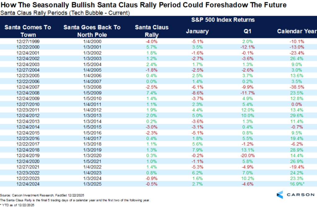 š But Hirsch emphasizes that the Santa Claus Rally is more than a feel-good stat. It often acts as an early sentiment gauge for the year ahead: