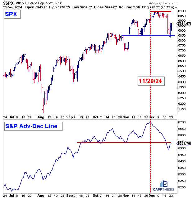 In late 2024, the advanceādecline line tracked the SPX higher through much of the fall and repeatedly made new highs into November. But that strength peaked on 11/29/24 ā and then the wheels came off.