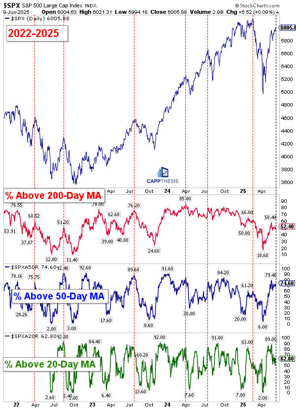 Longer-term the one to watch is obviously the % above the 200-DMA. That got as high as 58% and is now at 52%. It’s a lagging indicator, but we see how it hovered above the 70% level from late 2023 through late 2024. Thus, for the SPX to truly replicate that period, we’ll eventually need to see more stocks reclaim their long-term lines and stay above them…