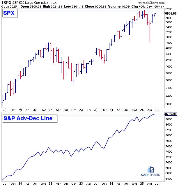 Let’s discuss market breadth. As we review every day in the Opening Look piece and every week and month in the comprehensive Roadmap reports, the SPX’s cumulative adv-dec line has been making new highs since May 2nd. Here’s the monthly chart. We dissected and how why the line has come back so strongly a few weeks ago in the 5/8 report entitled “Mirror Image.”
