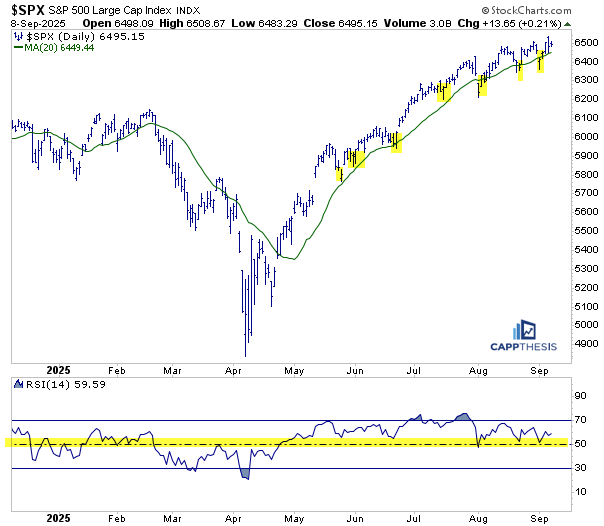 The real key is not whether RSI becomes overbought every time the S&P makes a new high, but whether it respects the midpoint of its range during pullbacks. And so far, that has clearly been the case.