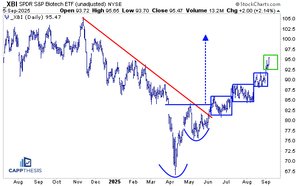 XBI had a strong week, capped by a solid showing on Friday. The ETF continues to extend from its cup-and-handle breakout in May and has now logged three straight Trading Box breakouts along the way. A fourth Trading Box is currently under construction, suggesting momentum remains firmly intact…