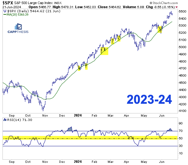 The initial lift through the 20-day moving average in November kept the index above that line into the start of 2024. Even when the 20-day was undercut for the first time, it did not mark the end of the rally back then either. In fact, the advance continued through the end of March, even as the index came close to — or briefly dipped under — the 20-day multiple times.